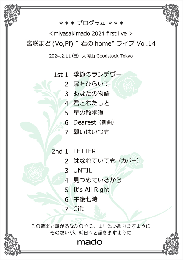 いつもの新曲も!そしてアットホームな時間と心温まって頂けるような気持ちをそえてお待ちしております。